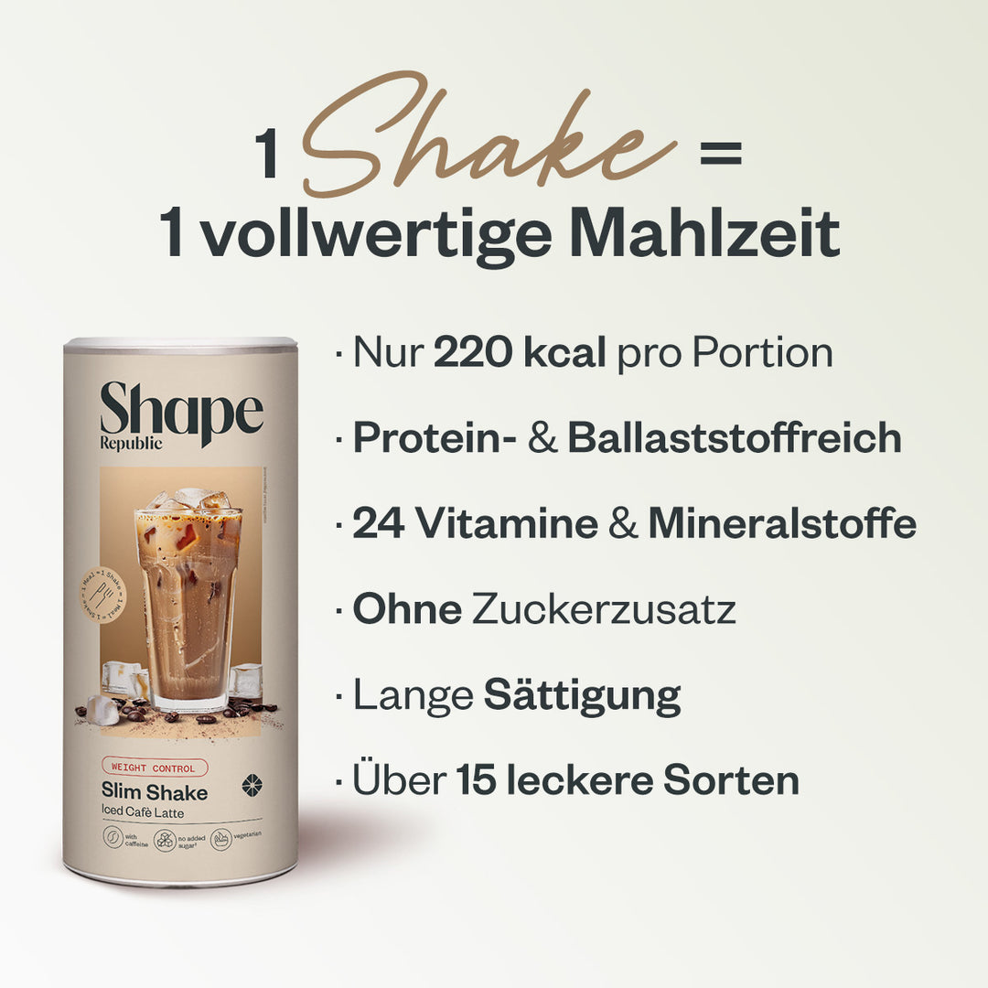 Unser Slim Shake? Cremig, smooth und voll im Geschmack. Dank unserer feinen Rezeptur und in Kombination mit dem Shape Republic Shaker bekommst du im Handumdrehen eine samtige Konsistenz – ganz ohne Nachhelfen.
