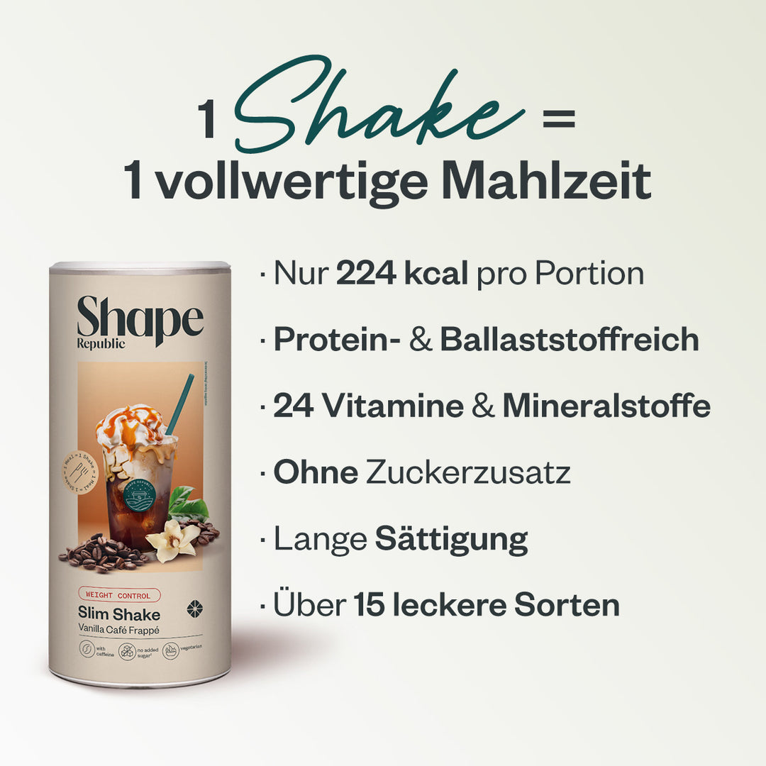 Unser Slim Shake? Cremig, smooth und voll im Geschmack. Dank unserer feinen Rezeptur und in Kombination mit dem Shape Republic Shaker bekommst du im Handumdrehen eine samtige Konsistenz – ganz ohne Nachhelfen.