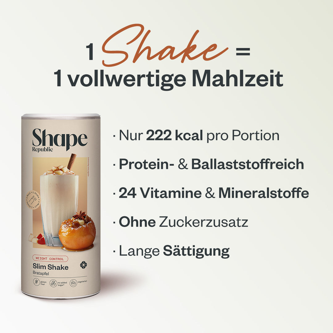 Du solltest maximal zwei Mahlzeiten am Tag durch einen Slim Shake ersetzen, wenn du Gewicht verlieren möchtest. Die Slim Shakes können dich über einen begrenzten Zeitraum dabei unterstützen, Gewicht zu verlieren. Ersetze eine Mahlzeit durch einen Shake um dein Gewicht zu halten. Achte außerdem auf eine ausreichende Flüssigkeitszunahme. Auch nach einer Diät kannst du die Slim Shakes wie z.B. Proteinpulver nutzen um deine Mahlzeiten geschmacklich aufzupeppen oder mit Nährstoffen anzureichern. Eine gesunde Lebensweise ist wichtig: Die reine Einnahme von Mahlzeitersatz Shakes ohne andere Lebensmittel über einen gewissen Zeitraum, kann nach Absetzen der Shakes zum sogenannten "Jo-Jo Effekt" führen. <i>Quelle: Hamann, A. "Adipositas." </i>