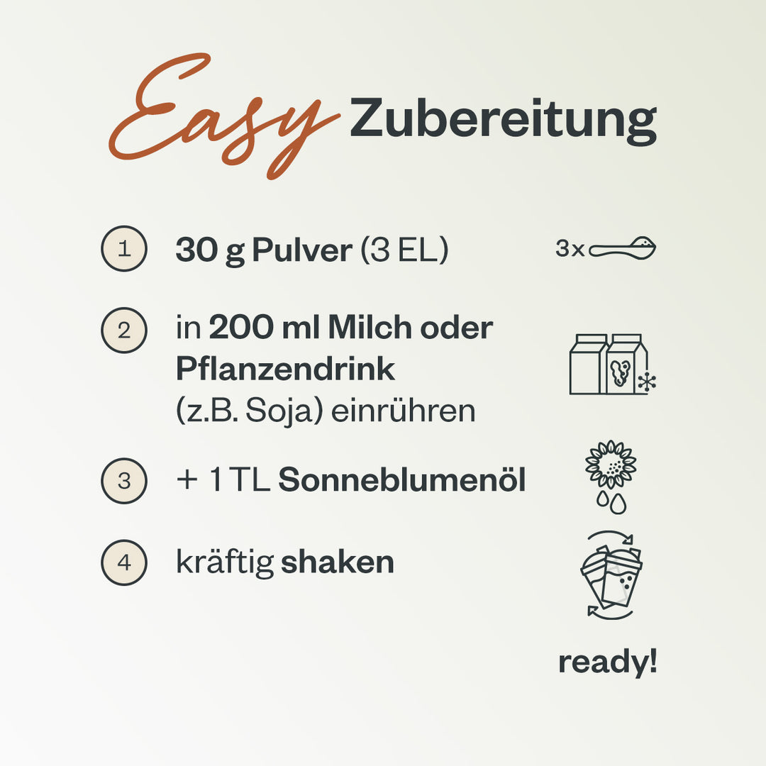 Dein Shake ist in nur drei Schritten fertig: Gib 200 ml fettarme Milch in den Shaker. Füge 3 EL (30g) Pulver + 1TL (3g) Sonneblumenöl hinzu. Schüttle alles gut durch. Fertig zum Genießen!