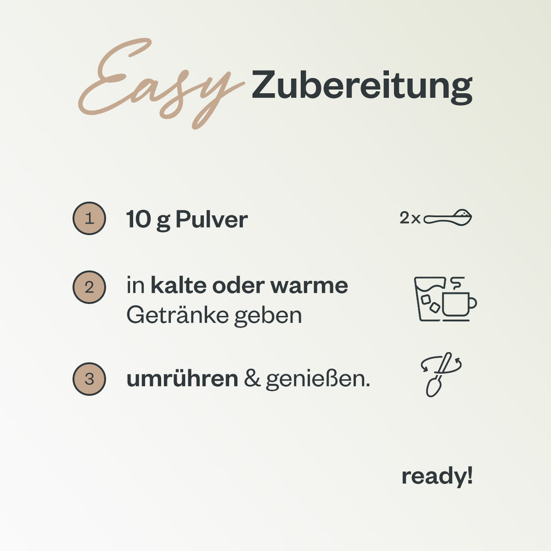 Allerdings nehmen manche Menschen dennoch einen leichten Eigengeschmack wahr – dies ist ganz natürlich und hängt vomindividuellenGeschmacksempfinden ab. Um das zu minimieren, empfehlen wir, das Pulver in geschmackvolle Getränke wie Säfte, Smoothies, Shakes oder auch Kaffee einzumischen. Auf diese Weise wird der Eigengeschmack überdeckt, und das Kollagen lässt sich ganz einfach in deinen Alltag integrieren.