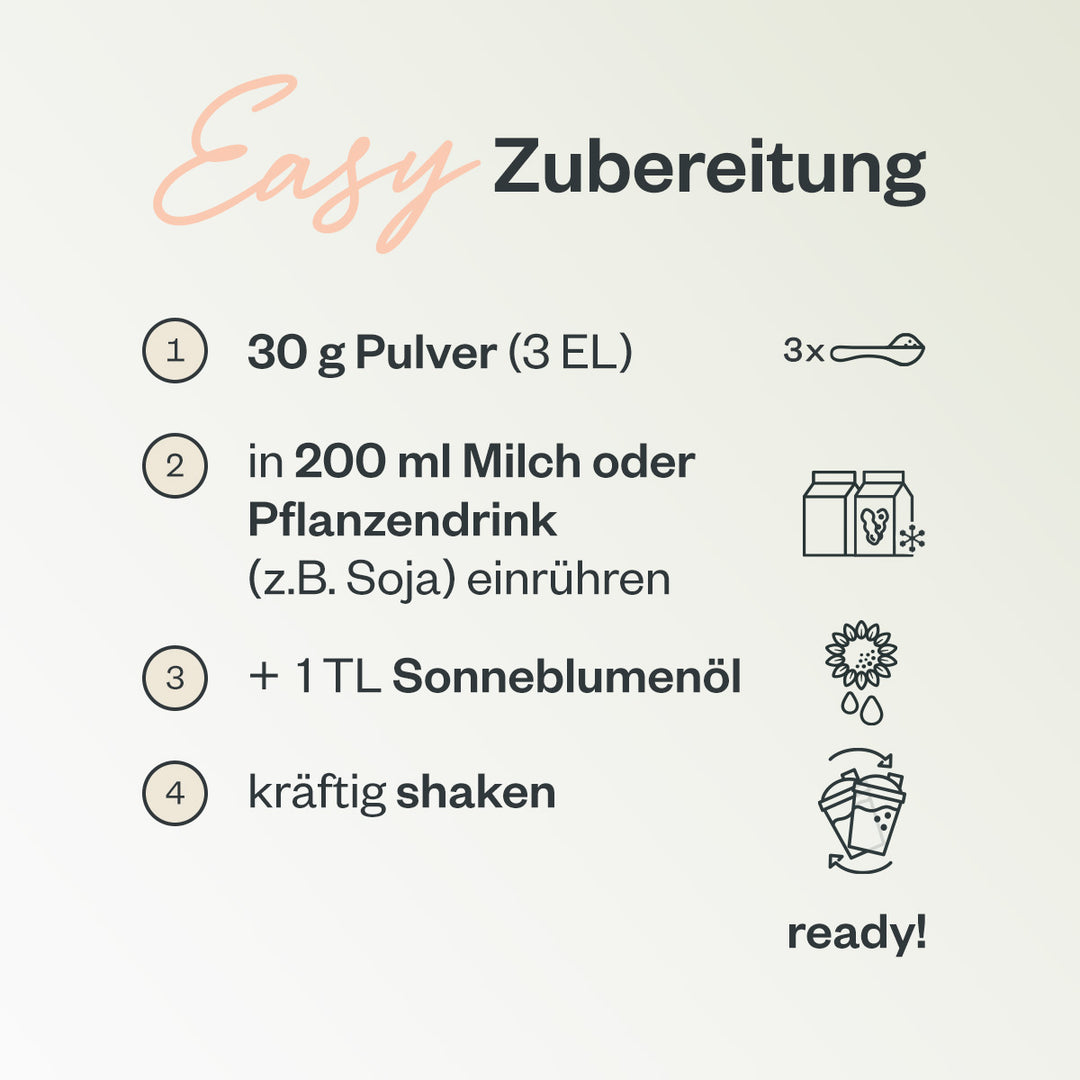 Klar, du kannst die Shakes gerne auch mit Mandeldrink, Haferdrink, Kokosdrink etc. anrühren. Bei einer Zubereitung mit Pflanzendrink ändern sich die Nährwerte pro Portion.